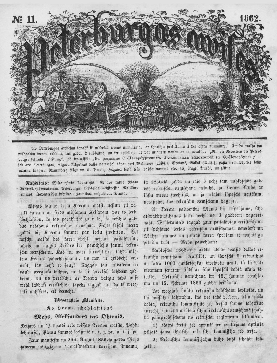 Photo Credit: Nacionālā Enciklopēdija Websitesi – “Peterburgas Avīzes”, 26 Temmuz 1862’den Haziran 1865’e kadar Petersburg’da yayınlanmış; genç Letonların ana yayın organıydı. Krišjānis Valdemārs tarafından yayınlanıyordu.